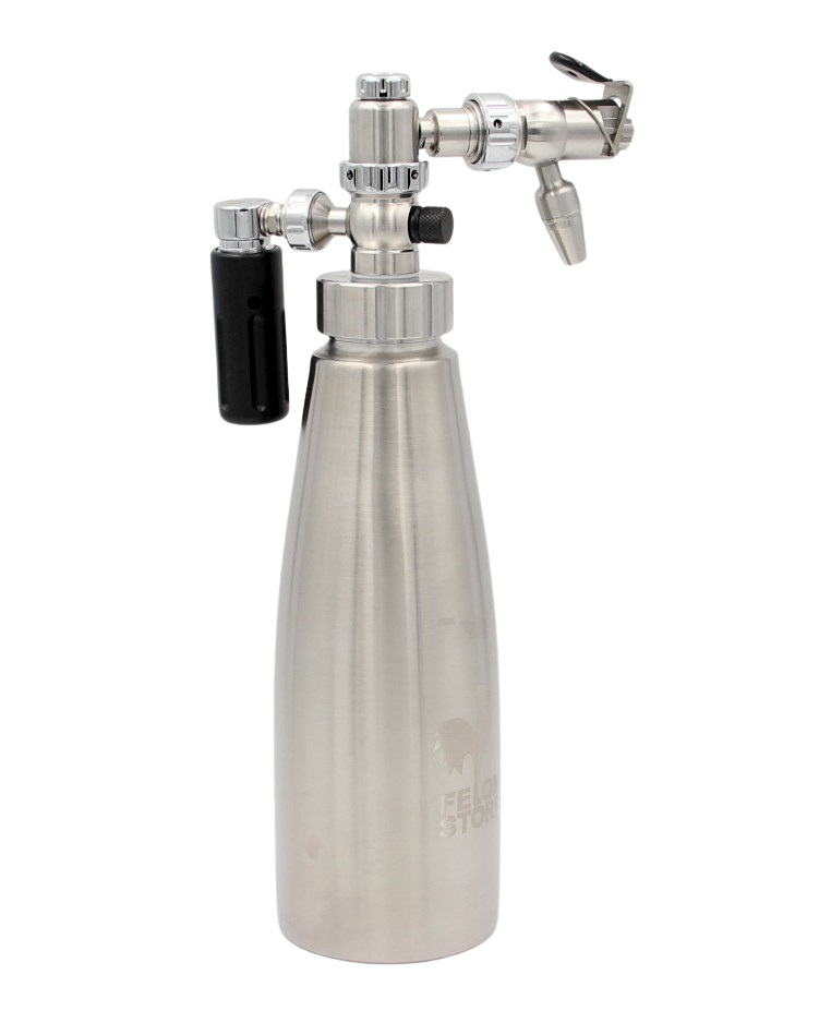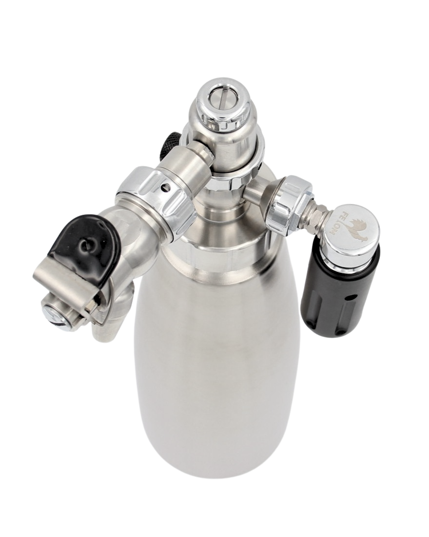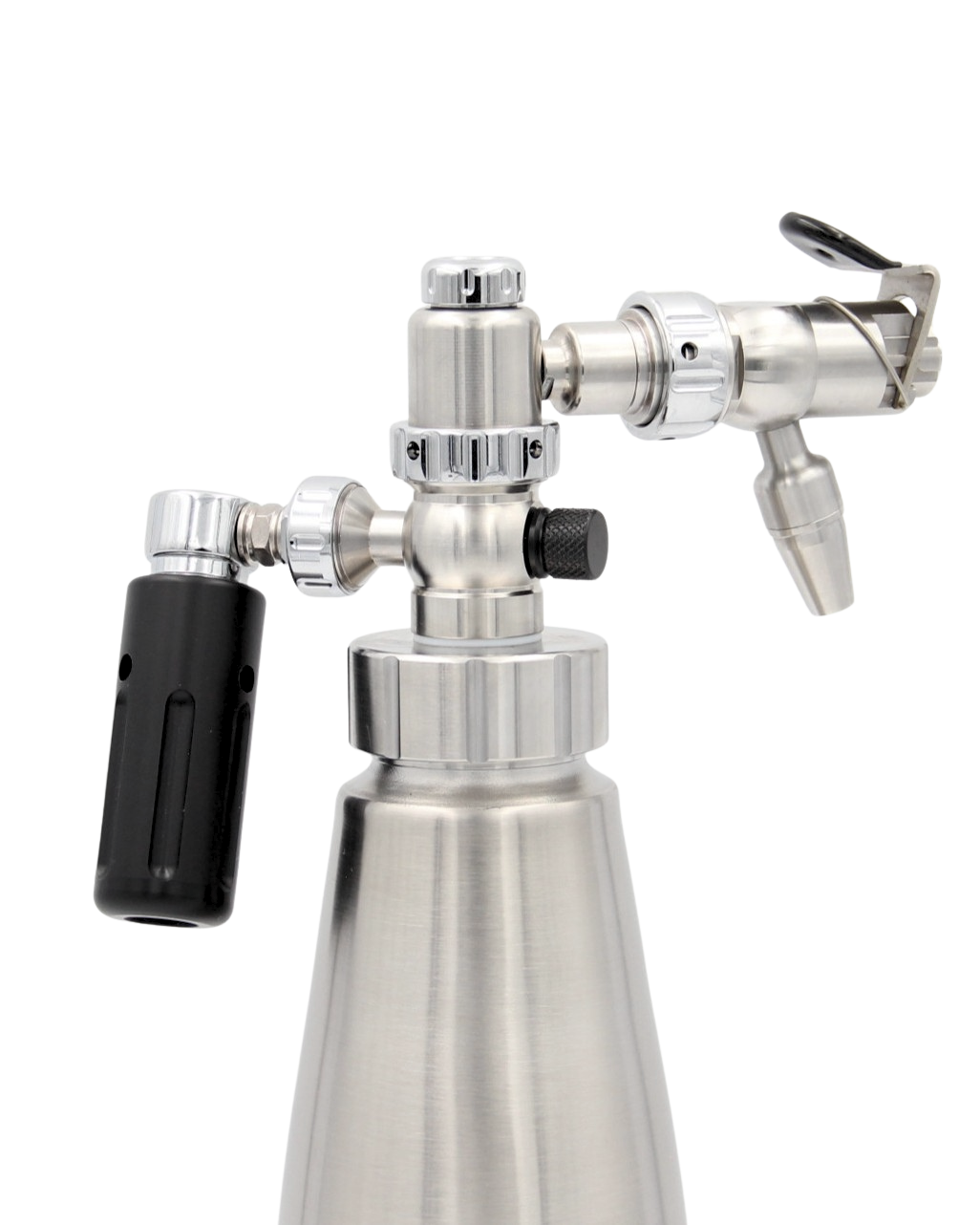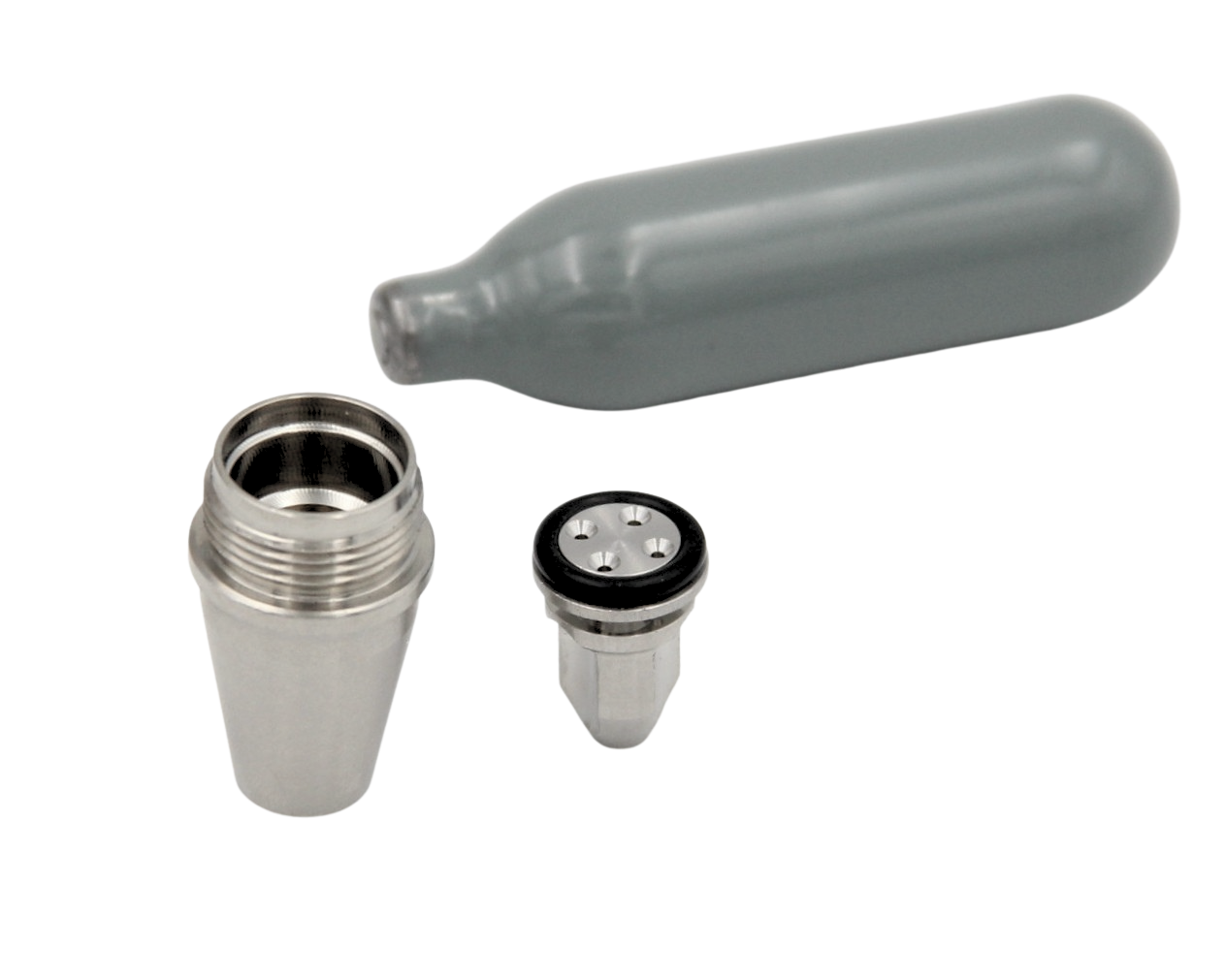 El compensador está en el cuerpo del adaptador y es fácil de higienizar. Se puede utilizar con cápsulas partidas de CO2 N2 N2O, o con gas de botella de Co2 N2O.